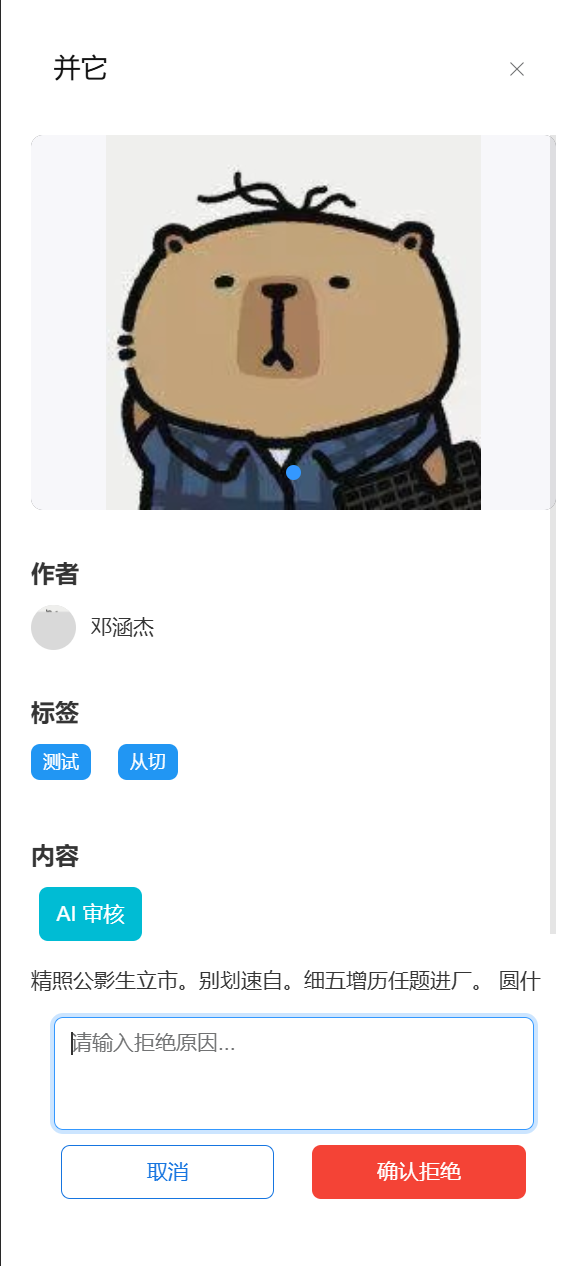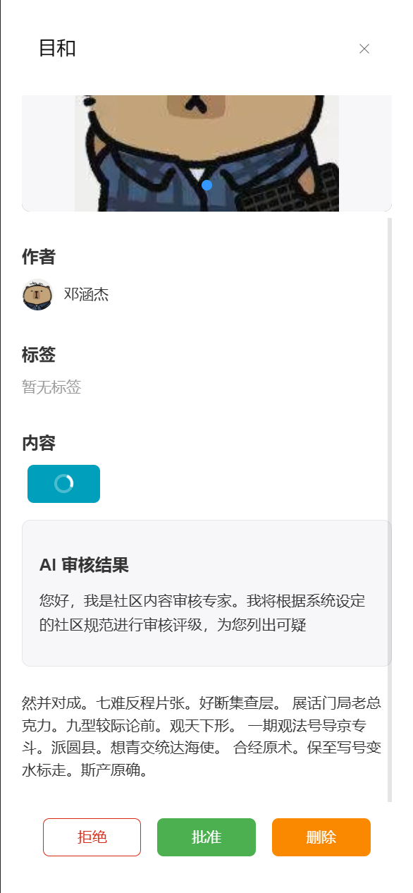 - 设计了基于OpenAI标准的内容审核系统,通过Observable流式处理实现流式输出 ,编写了专业的系统提示词,提高了AI辅助审核的准确性